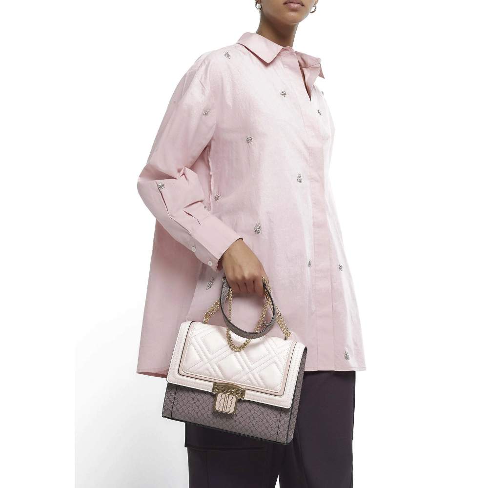 This River Island cross-body bag blends chic style with everyday practicality. It features a light pink quilted top paired with a textured lower panel for a modern, feminine look. The gold-tone chain strap allows for comfortable cross-body wear, while the elegant metallic front clasp adds a sophisticated finish. Perfect for day-to-night styling, this versatile bag is an effortless way to elevate any outfit.