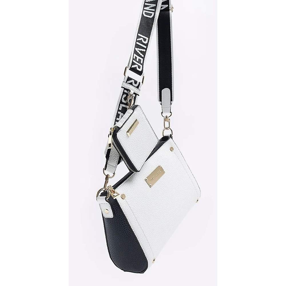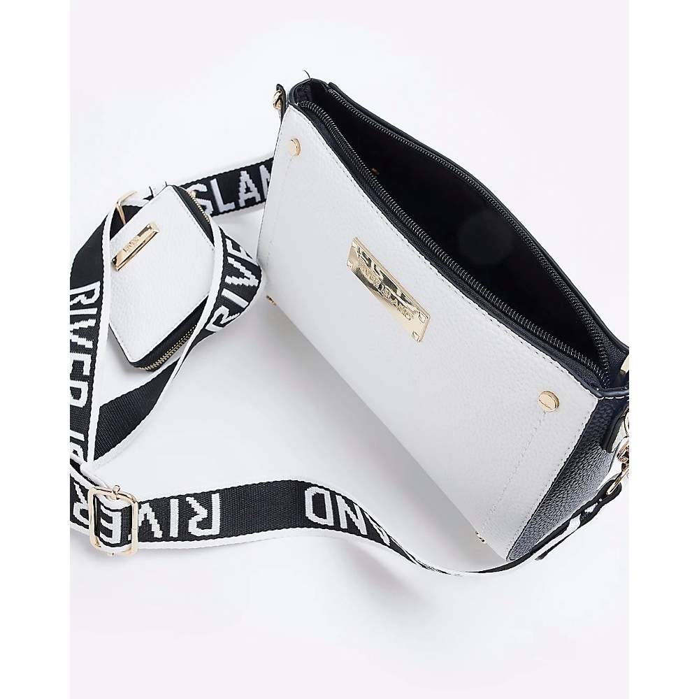 Elevate your everyday style with this chic White RI Monogram Structured Cross Body Bag from River Island. Designed with a clean, modern silhouette, this compact yet functional bag features the signature RI monogram print and elegant gold-tone hardware for a luxe finish.